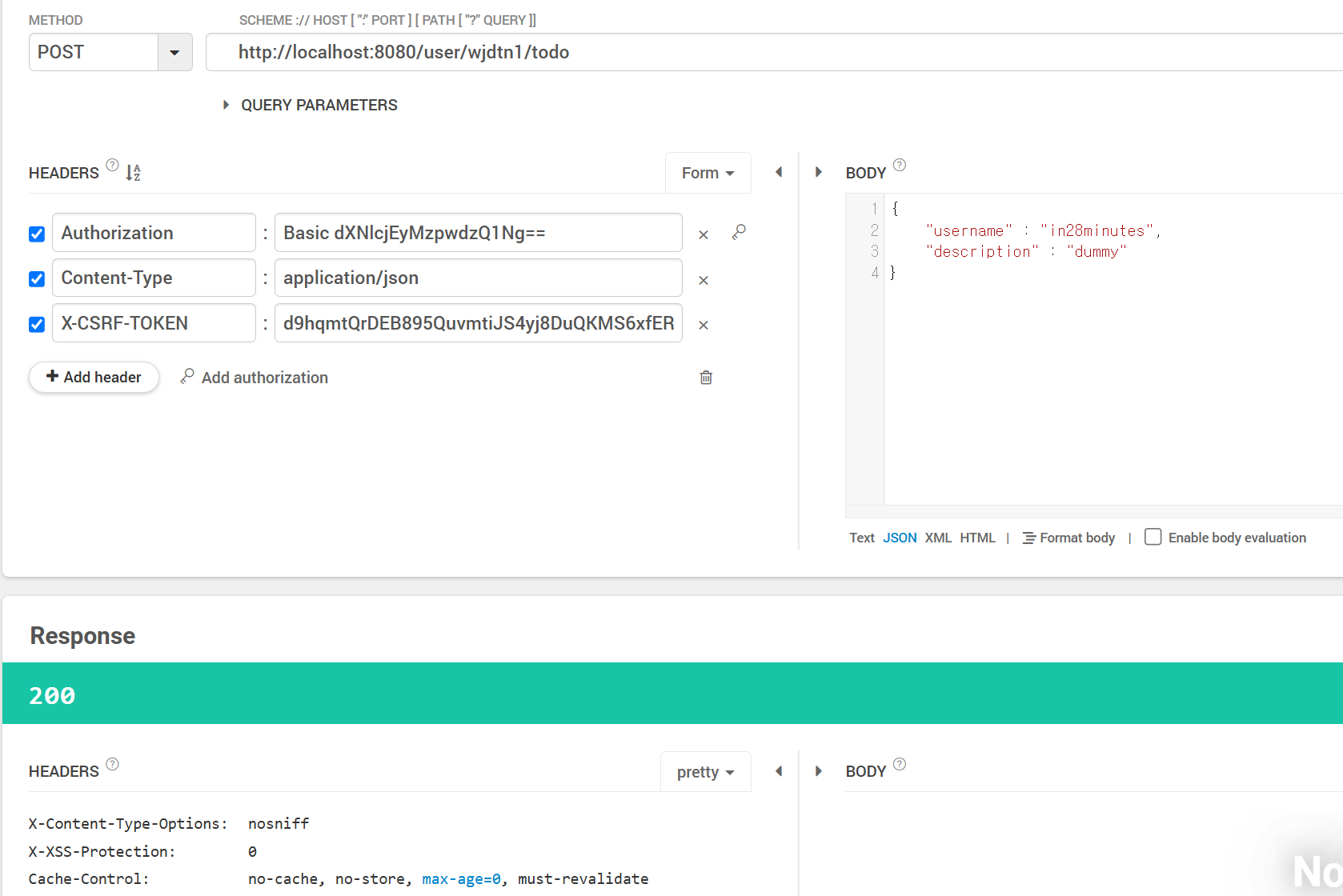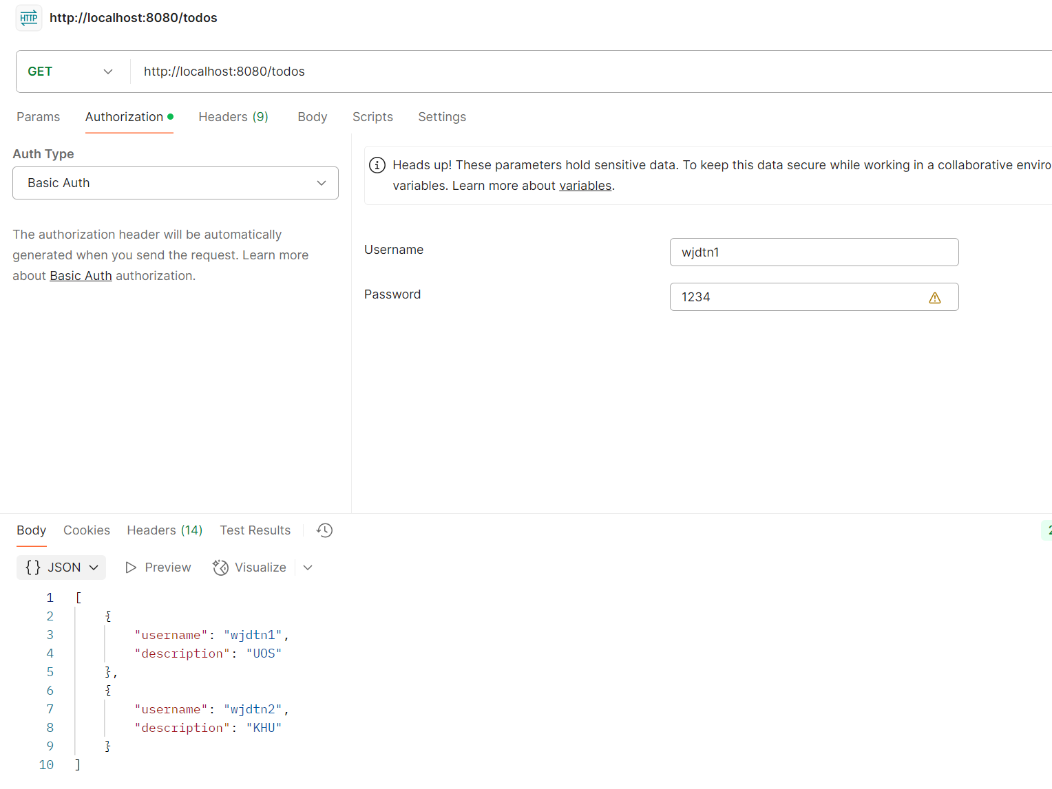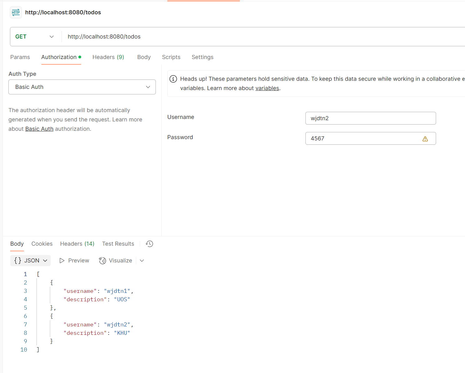 。이후DB에 저장된 자격증명을 통해HTTP Basic Authentication을 통해HTTP Request를 전송 시 성공적으로HTTP Reponse를 반환하여 Application의 Resource에 접근이 가능함을 확인 가능.