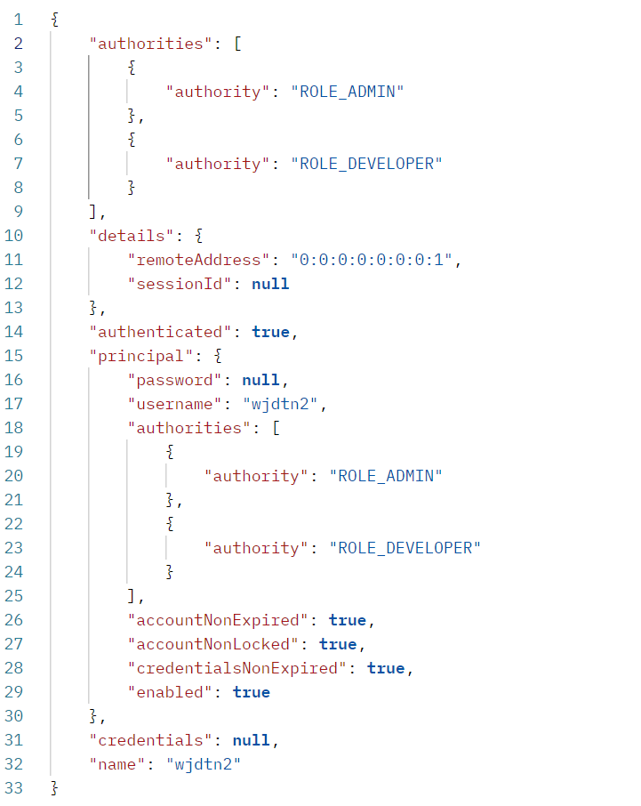 UserDetails userDetails = User.withDefaultPasswordEncoder() .username("wjdtn") .password("123456") .roles("USER","ADMIN") // 특정 작업을 수행하기 위한 역할 설정 .build();