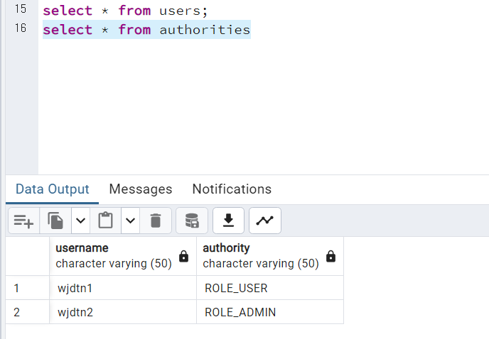 。DB에서JDBC를 통한 사용자인증을 위한 기본 테이블로서 생성한usersDB Table에 사용자 자격증명이 성공적으로 추가된 것을 확인 가능.