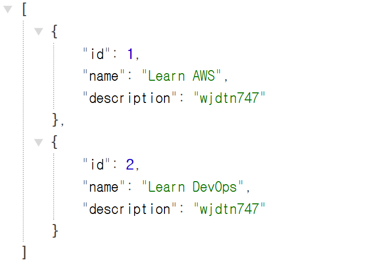 ex)List<Class객체>▶ JSONpublic List<Course> retrieveAllCourses(){ return Arrays.asList( new Course(1,"Learn AWS","wjdtn747"), new Course(2,"Learn DevOps","wjdtn747"),
