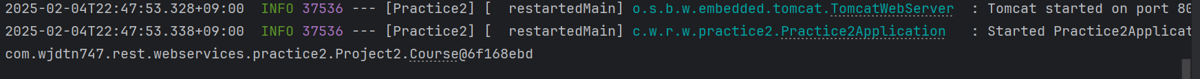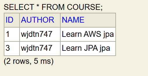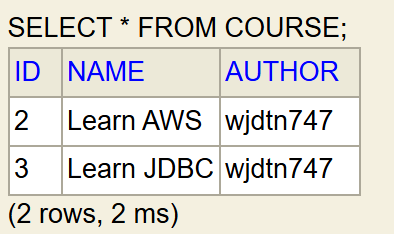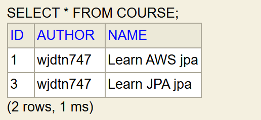 JpaRepository를 상속한 Interface를 Field-based Injection 및DB Entity를 이용해 DB와 상호작용.// CourseCommandRunner.java import org.springframework.beans.factory.annotation.Autowired; import org.springframework.boot.CommandLineRunner; import org.springframework.stereotype.Component; @Component public class CourseCommandRunner implements CommandLineRunner { @Autowired private CourseSpringDataJpaRepository rp; public void run(String... args) throws Exception { rp.save(new Course2(1,"Learn AWS jpa","wjdtn747")); rp.save(new Course2(2,"Learn JDBC jpa","wjdtn747")); rp.save(new Course2(3,"Learn JPA jpa","wjdtn747")); rp.deleteById(2l); // Integer를 Long type으로 형변환. System.out.println(rp.findById(1l)); System.out.println(rp.findById(3l)); System.out.println(rp.findAll()); System.out.println(rp.count()); } }。