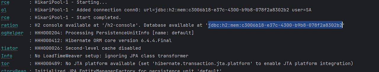 ▶ Application 실행 시 console에서 지시하는JDBC URL를 h2-console 사이트의JDBC URL에 입력하여 h2 console로 진입한다.