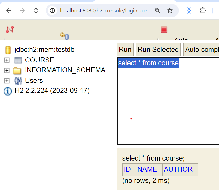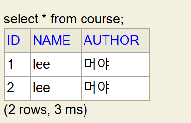 。sql파일을src/main/resources/경로에 생성. ( 반드시 해당 경로에 존재해야함.)# schema.sql create table course( id bigint not null, name varchar(255) not null, author varchar(255) not null, primary key (id) );。
