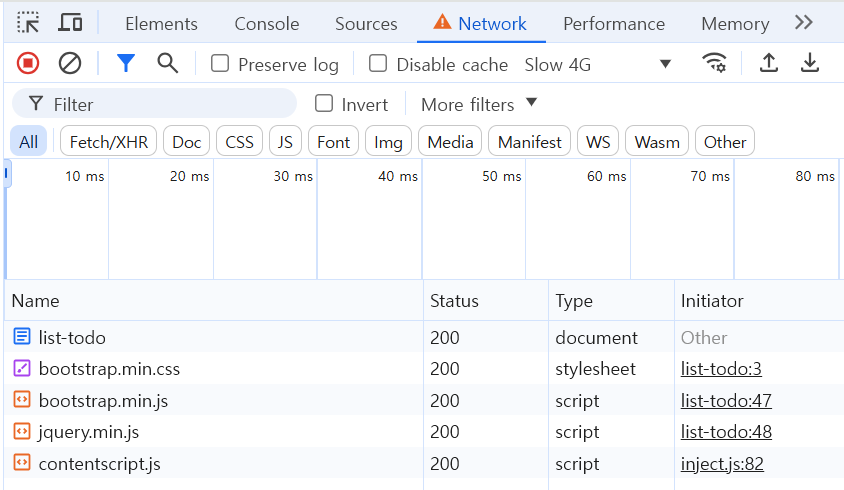 ▶ 브라우저는list-todo의 contents에 bootstrap의 css,js파일의 link를 관측 후 해당 파일들을 전부 다운로드.Bootstrap은