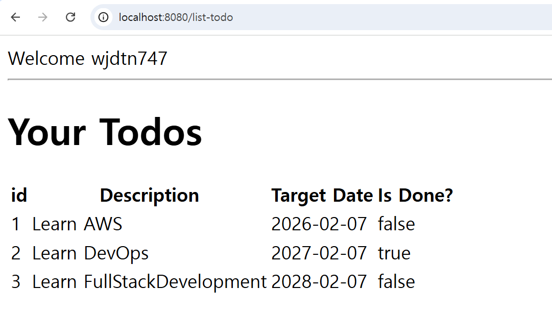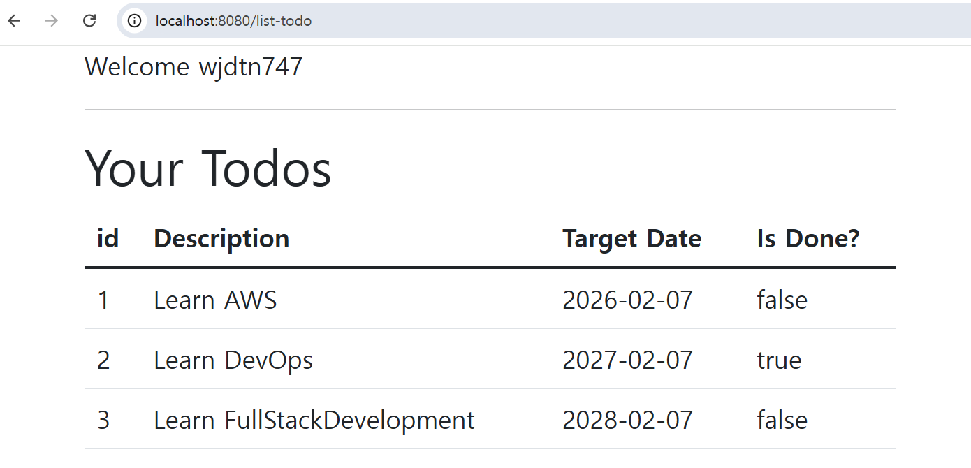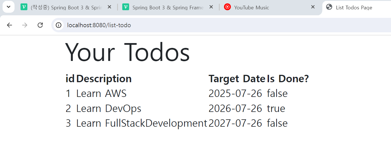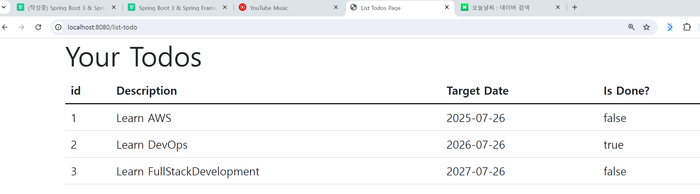 html에서javascript활용 시 body의 종료태그</body>앞에<script>를 통해 파일 연결.<script src="webjars/bootstrap/5.1.3/js/bootstrap.min.js"></script> <script src="webjars/jquery/3.6.0/jquery.min.js"></script><%@ taglib uri="http://java.sun.com/jsp/jstl/core" prefix="c"%> <html lang="kor"> <head> <!-- css 파일 설정 --> <link href="webjars/bootstrap/5.1.3/css/bootstrap.min.css" rel="stylesheet"> <title>List Todos Page</title> </head> <body> <!-- div class 지정. --> <div class="container"> <h1>Your Todos</h1> <table class="table"> <thead> <tr> <th>id</th> <th>Description</th> <th>Target Date</th> <th>Is Done?</th> </tr> </thead> <tbody> <!-- taglib 선언 후 다음 forEach 함수 사용 가능. --> <c:forEach items="${todos}" var="todo"> <tr> <td>${todo.id}</td> <td>${todo.description}</td> <td>${todo.targetDate}</td> <td>${todo.completed}</td> </tr> </c:forEach> </tbody> </table> </div> <!-- script 파일 설정 --> <script src="webjars/bootstrap/5.1.3/js/bootstrap.min.js"></script> <script src="webjars/jquery/3.6.0/jquery.min.js"></script> </body> </html>。이후
