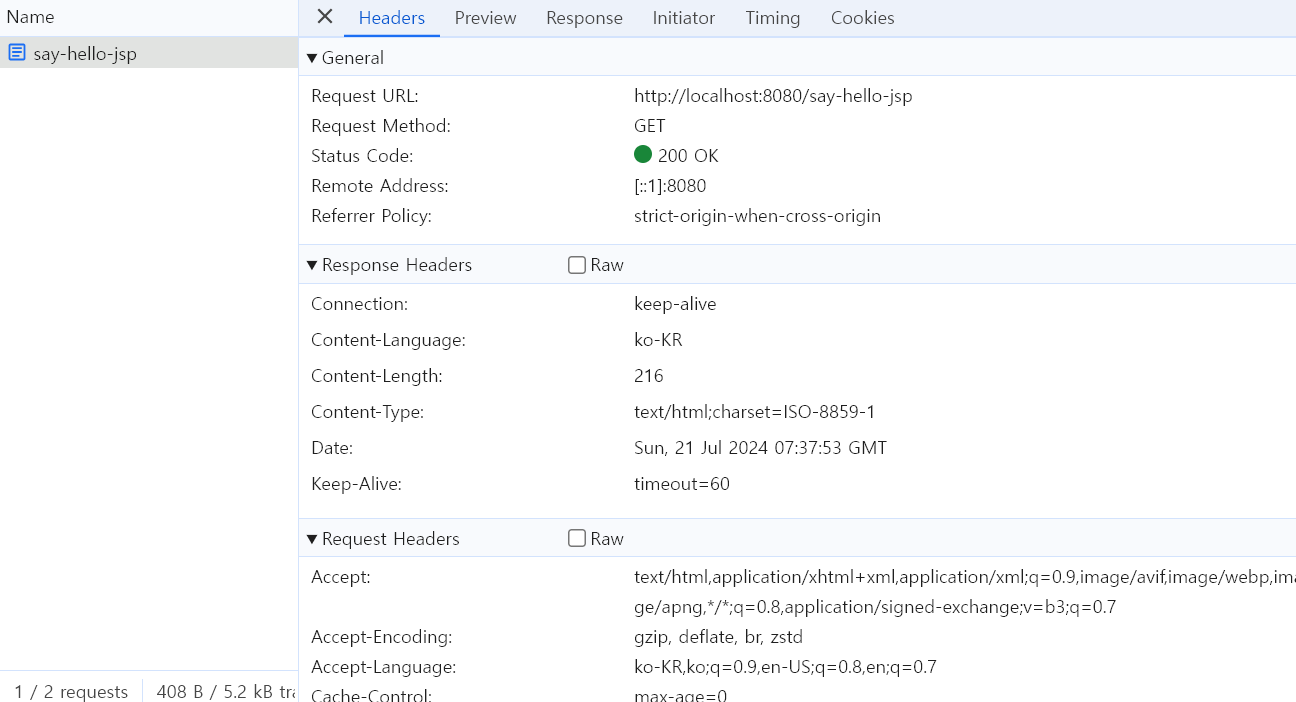 - 이때, 진입한 웹페이지 화면에서 마우스 오른쪽버튼을 눌러 Inspect -> Network -> Doc -> say-hello-jsp로 진입 시 다음 화면이 나옴.