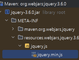 。External Libraries-Maven: org.webjars:jquery:3.6.0에서jquery.min.js를 동일하게 찾은 후 copy path.