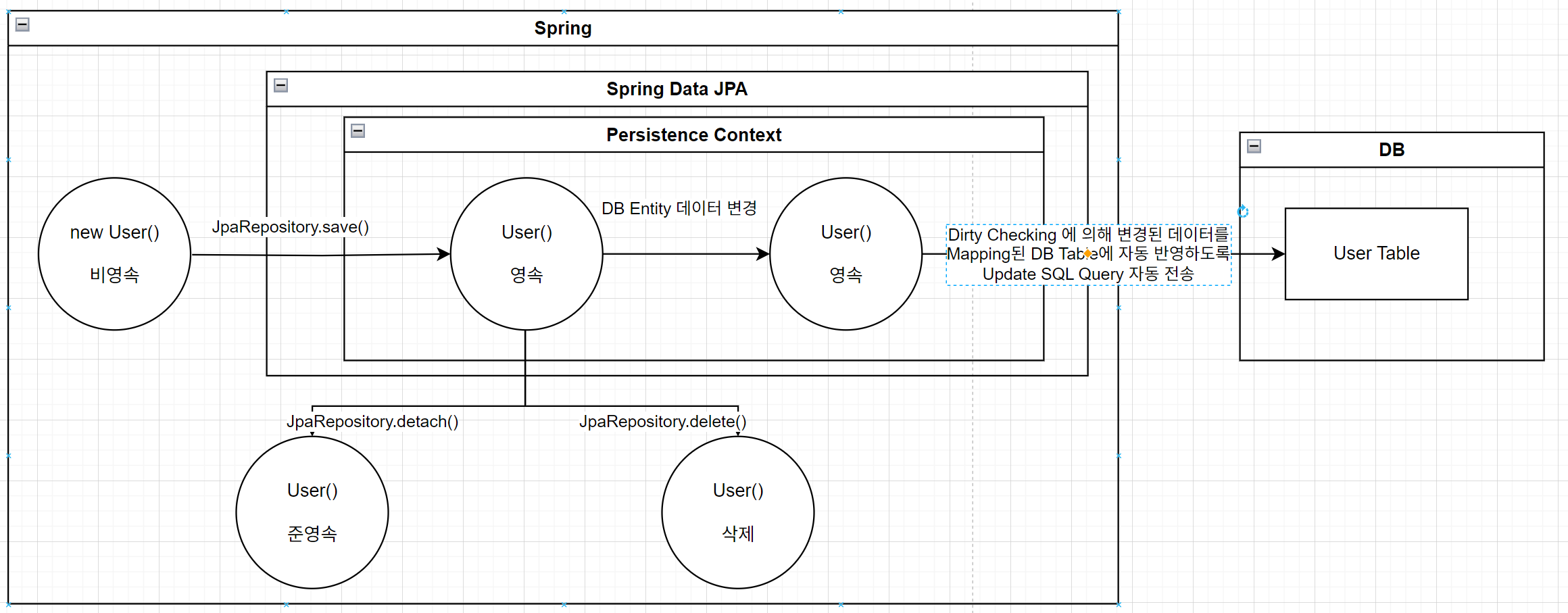 。영속성 컨텍스트에서 관리되는DB Entity 객체의 변경 시Dirty Checking에 의해Mapping된DB Table에도 변경 수행