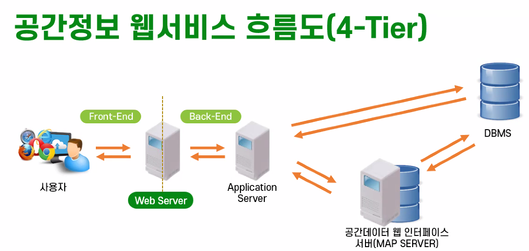 。Map Server: 사용자 브라우저에서 지도를 조작 시 일일이 Vector로 point, line, polygon을 Server-side에서 렌더링하여 사용자에게 이미지 형태로 가공하여 WMS, WTMS로서 지도데이터를 제공.
