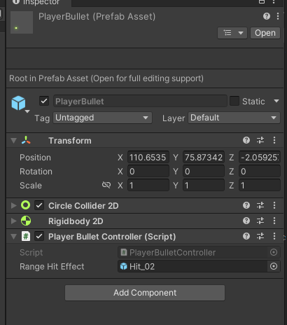 벽이나 적에게 충돌시 발생 할 Hit Effect를 담을 프리팹도 준비해서 인스펙터에서 연결.