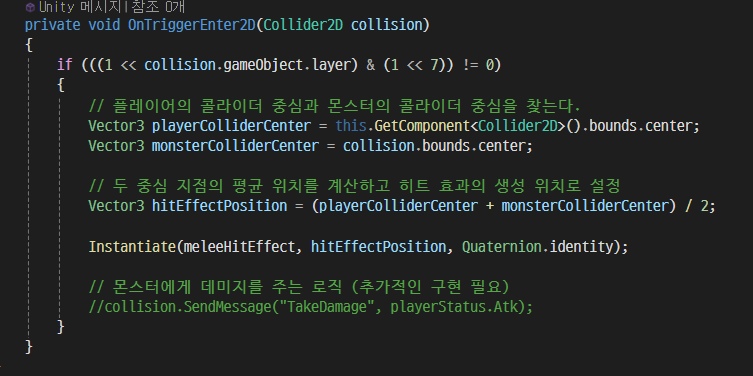 현재 사용하고 있는 OnTriggerEnter 충돌 검사 방식을 유지하되, 플레이어와 몬스터 사이에 적절한 히트 이펙트 위치를 구현해보고자 했다.