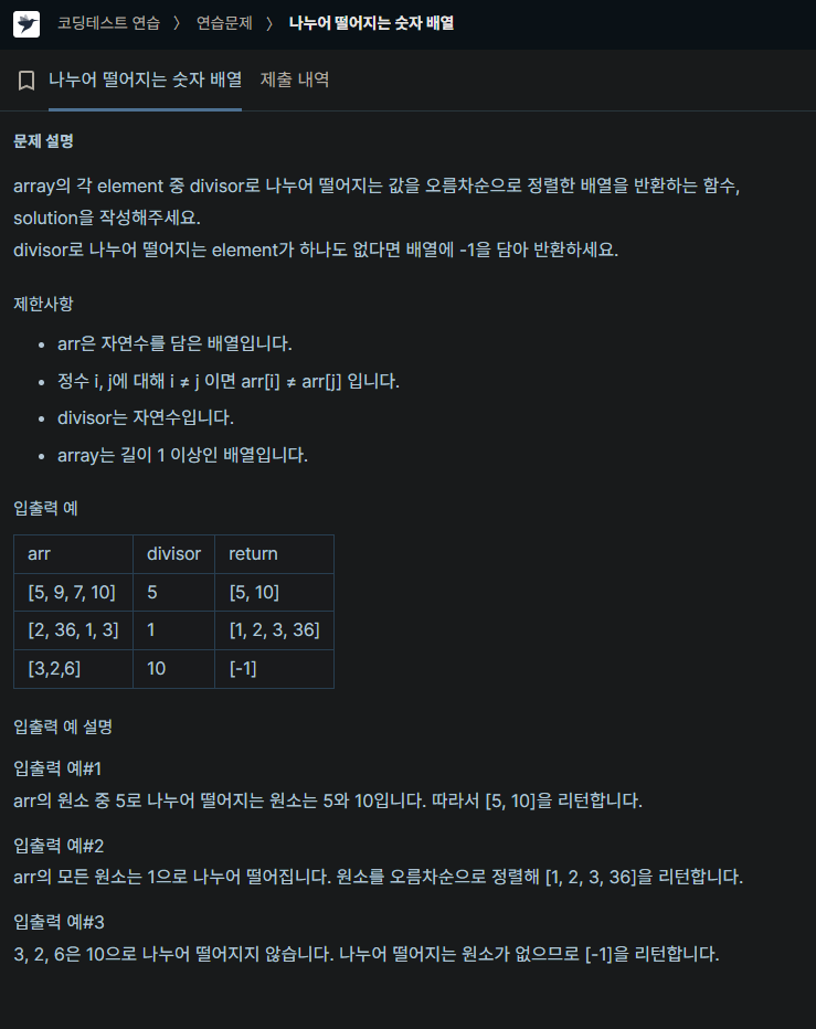 정수 배열 arr과 나누는 수 divisor를 입력 받아 배열 내의 요소 중 divisor로 나누어 떨어지는 수만을 추출해 새로운 배열을 만들고, 오름차순으로 정렬하여 반환.