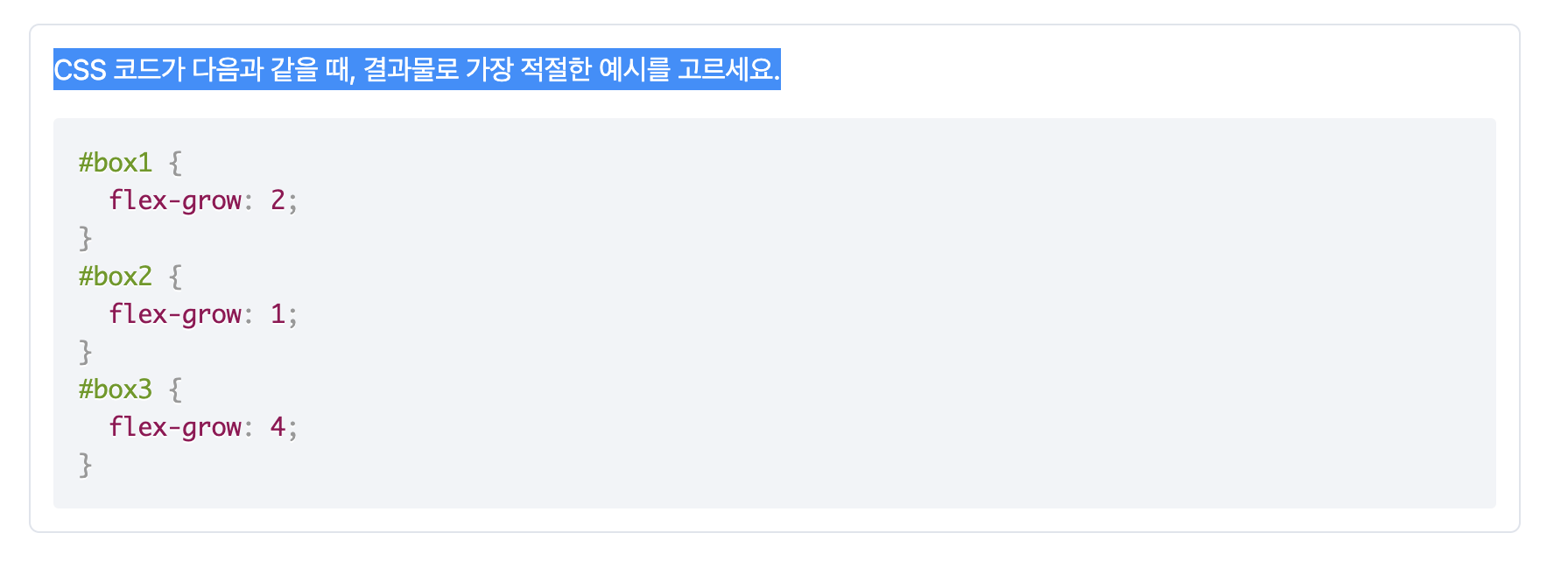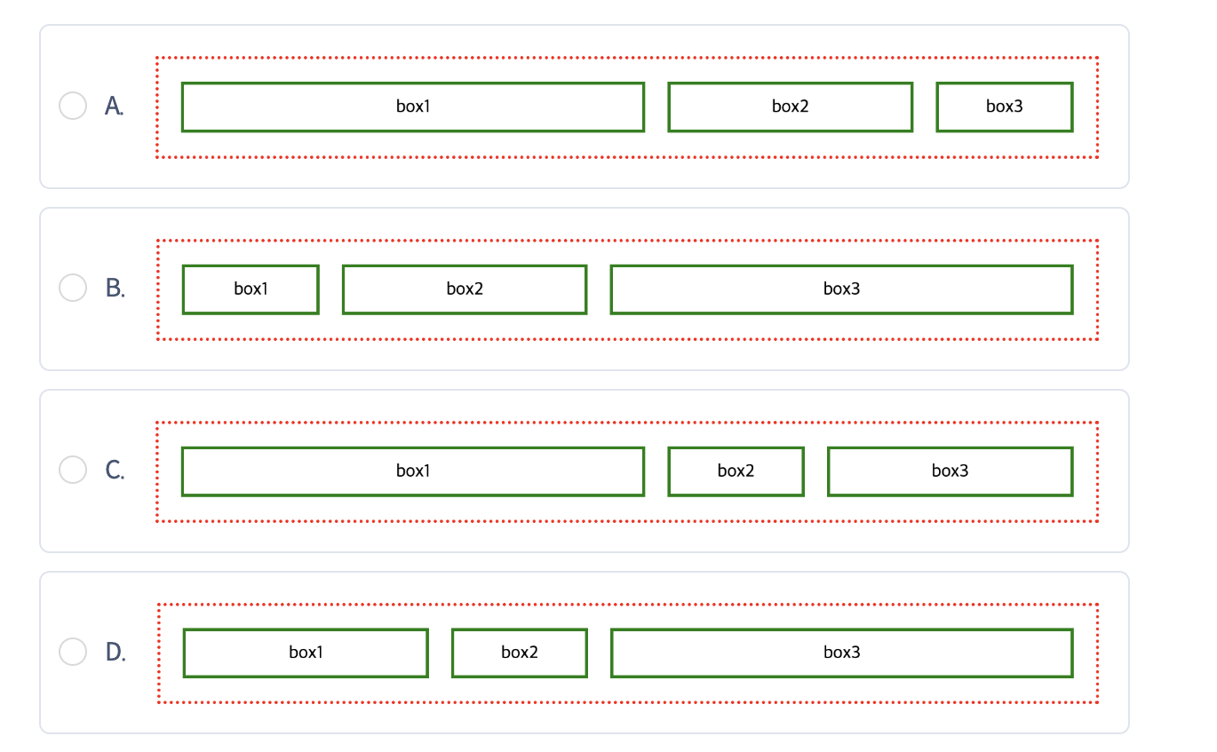 해설: CSS 코드는 각 박스 요소에 적용된 flex-grow 값을 보여주고 있습니다. -grow는 부모 요소에 빈 공간이 있을 때 요소가 얼마나 늘어날지 비율을 뜻하므로, 같은 부모의 자식 요소라면 flex-grow 의 값이 클 수록 더 많은 공간을 차지하게 됩니다. 즉, 박스의 크기는 box3 (flex-grow : 4;) > box1 (flex-grow : 2;) > box2 (flex-grow : 1;) 순서가 됩니다.