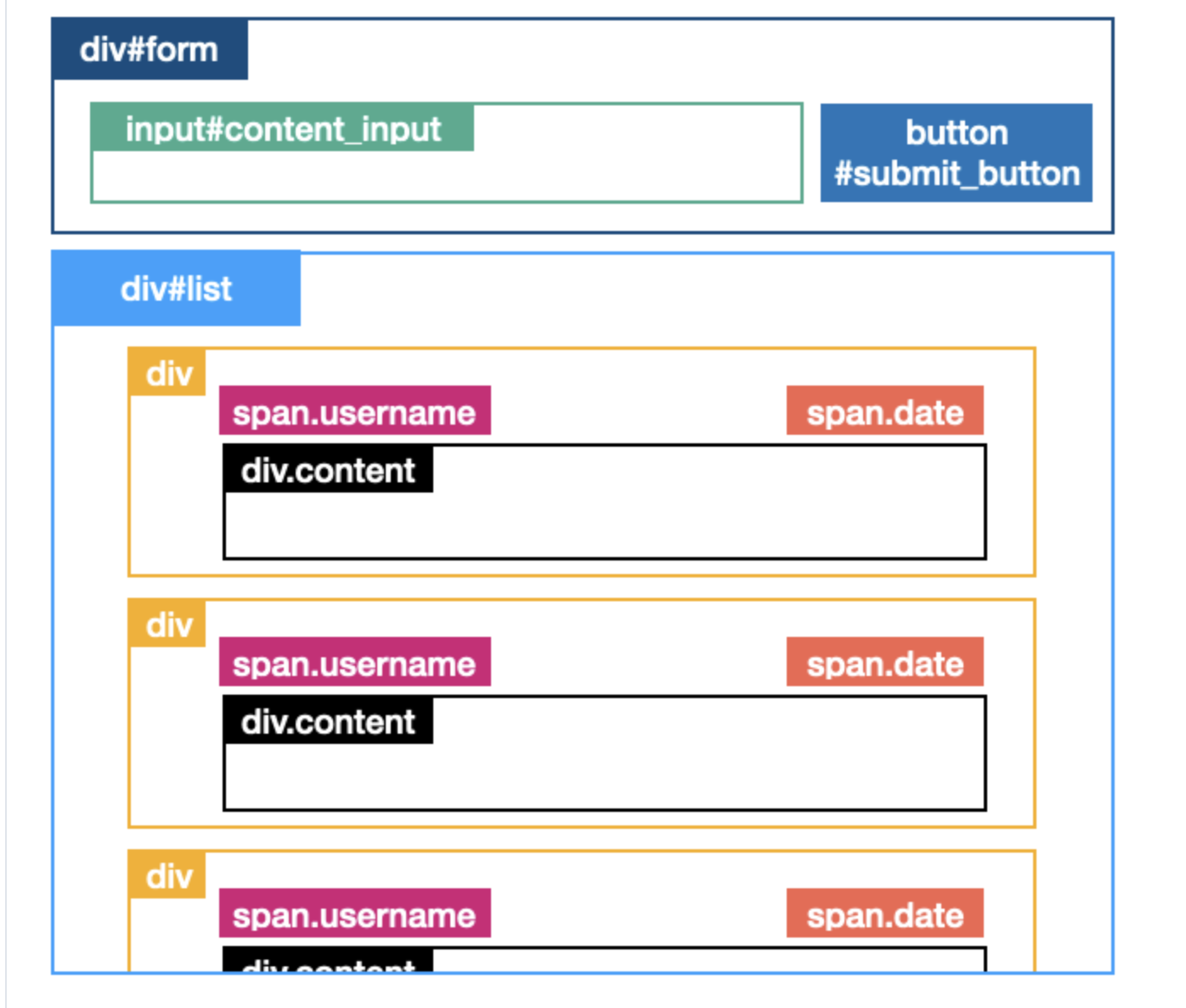 해설: 와이어프레임을 살펴보면, input 요소에 내용을 입력하고 button 을 누르면, 아래 div#list 에 username, date, content 를 감싸는 div 요소가 추가되는 방식으로 작동하는 프로그램으로 보입니다. 보통 게시글에 댓글을 작성하는 부분이 해당 와이어프레임과 유사한 형태를 가집니다.