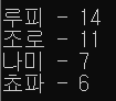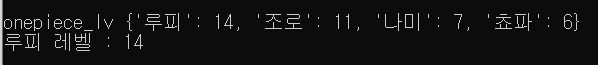 onepiece_lv = {'루피' : 14, '조로' : 11, '나미' : 7, '쵸파' : 6} print(f"onepiece_lv {onepiece_lv}") print(f"루피 레벨 : {onepiece_lv['루피']}") print()