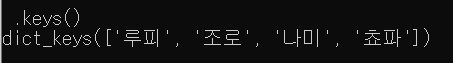 - dictionary 의 key 만을 tuple 로 모아서 dict_keys 객체로 반환합니다.