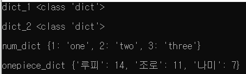 dict_1 = {} print(f"dict_1 {type(dict_1)}") print()dict_2 = dict() print(f"dict_2 {type(dict_2)}") print()num_dict = { 1:'one', 2:'two', 3:'three'} print(f"num_dict {num_dict}") print()onepiece_dict = { '루피': 14, '조로':11, '나미' : 7 } print(f"onepiece_dict {onepiece_dict}") print()