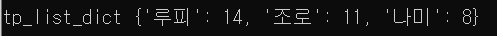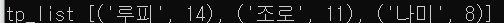 tp_list = [('루피', 14), ('조로',11), ('나미', 8)] print(f"tp_list {tp_list}") print()