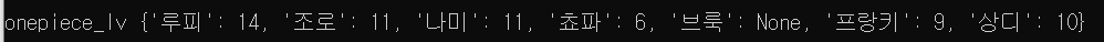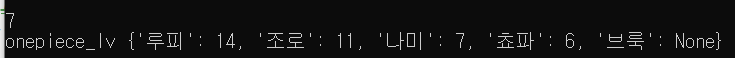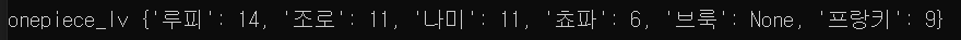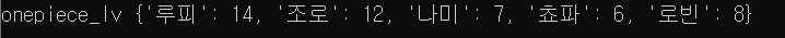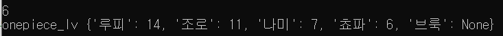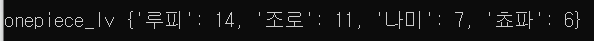 onepiece_lv = {'루피' : 14, '조로' : 11, '나미' : 7, '쵸파' : 6} print(f"onepiece_lv {onepiece_lv}") print()
