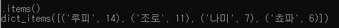 - key 와 value 의 쌍을 tuple 로 묶어서 dict_items 객체로 반환합니다.
