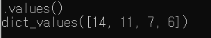 - dictionary 의 values 만을 tuple 로 모아서 dict_values 객체로 반홥합니다.