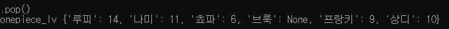 print(".popitem()") print(f"삭제 {onepiece_lv.popitem()}") print(f"onepiece_lv {onepiece_lv}")