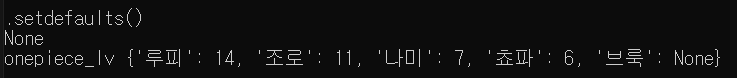 print(".setdefaults()") print(onepiece_lv.setdefault('브룩')) print(f"onepiece_lv {onepiece_lv}") print()