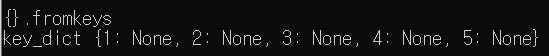 print("{}.fromkeys") key_list = [ 1, 2, 3, 4, 5 ] key_dict = {}.fromkeys(key_list) print(f"key_dict {key_dict}") print()
