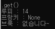 print(".get()") print(f"루피 : {onepiece_lv.get('루피')}") print(f"프랑키 : {onepiece_lv.get('프랑키')}") print(f"브룩 : {onepiece_lv.get('브룩', '없습니다~')}") print()