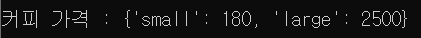 size_tu = ('small', 'large') coffee_dict = { size_tu[0]:180, size_tu[1]: 2500 } print(f"커피 가격 : {coffee_dict}") print()