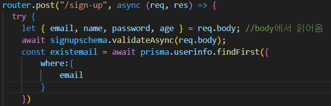 의도는 req.body 데이터를 joi로 검증할려고 적은것인데 잘못된 코드로 req.body 데이터를 읽지 못했고,