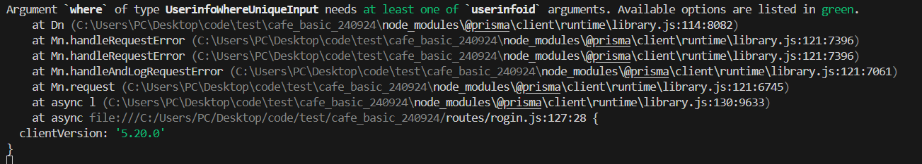 UserinfoWhereUniqueInput 유형의 'where' 인수에는 'userinfoid' 인수 중 하나 이상이 필요합니다. 사용 가능한 옵션은 녹색으로 나열되어 있습니다.