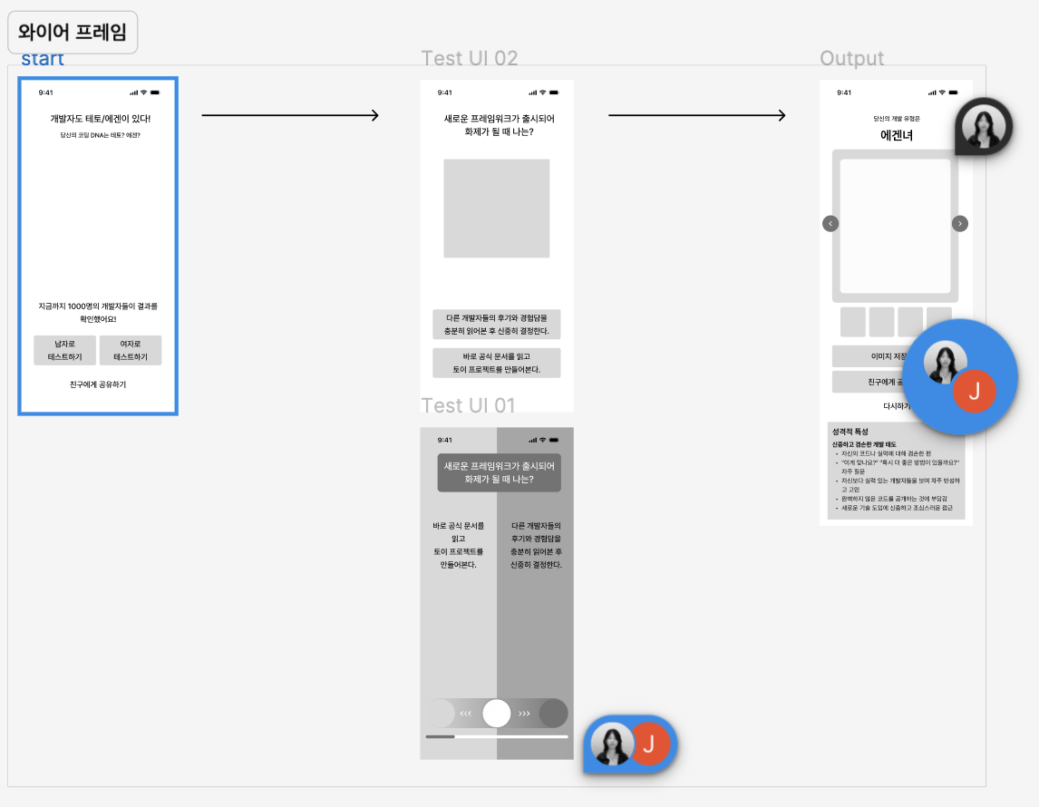 테스트는 모든 과정이 서버에 요청 없이 클라이언트에서 진행되고 진행의 결과를 모두 세션에 저장해 공유 혹은 이미지 저장을 할 때 해당 세션값을 기준으로 결과가 포함된 이미지와 공유링크를 만들 수 있었다.