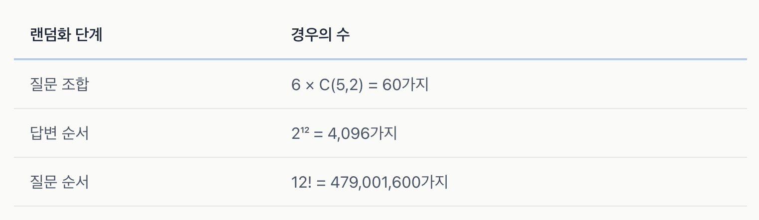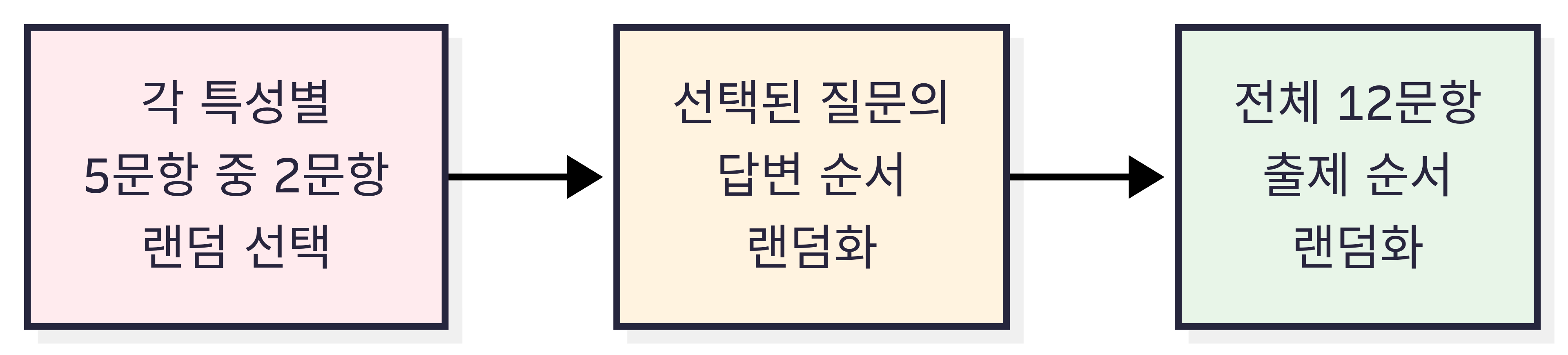 30개 문항을 모두 보여주면 너무 길어져 유저 이탈이 생길 것이라고 예상했고, 테스트 완료율을 높이기 위해 각 특성별로 2개씩 랜덤 선택해 총 12개 문항만 제시했다. 이렇게 되면 부담 없는 테스트 시간을 만들 수 있고 재시도 시에 매번 다른 문항이 나타나기에 사용자의 재미 요소까지 챙길 수 있었다.