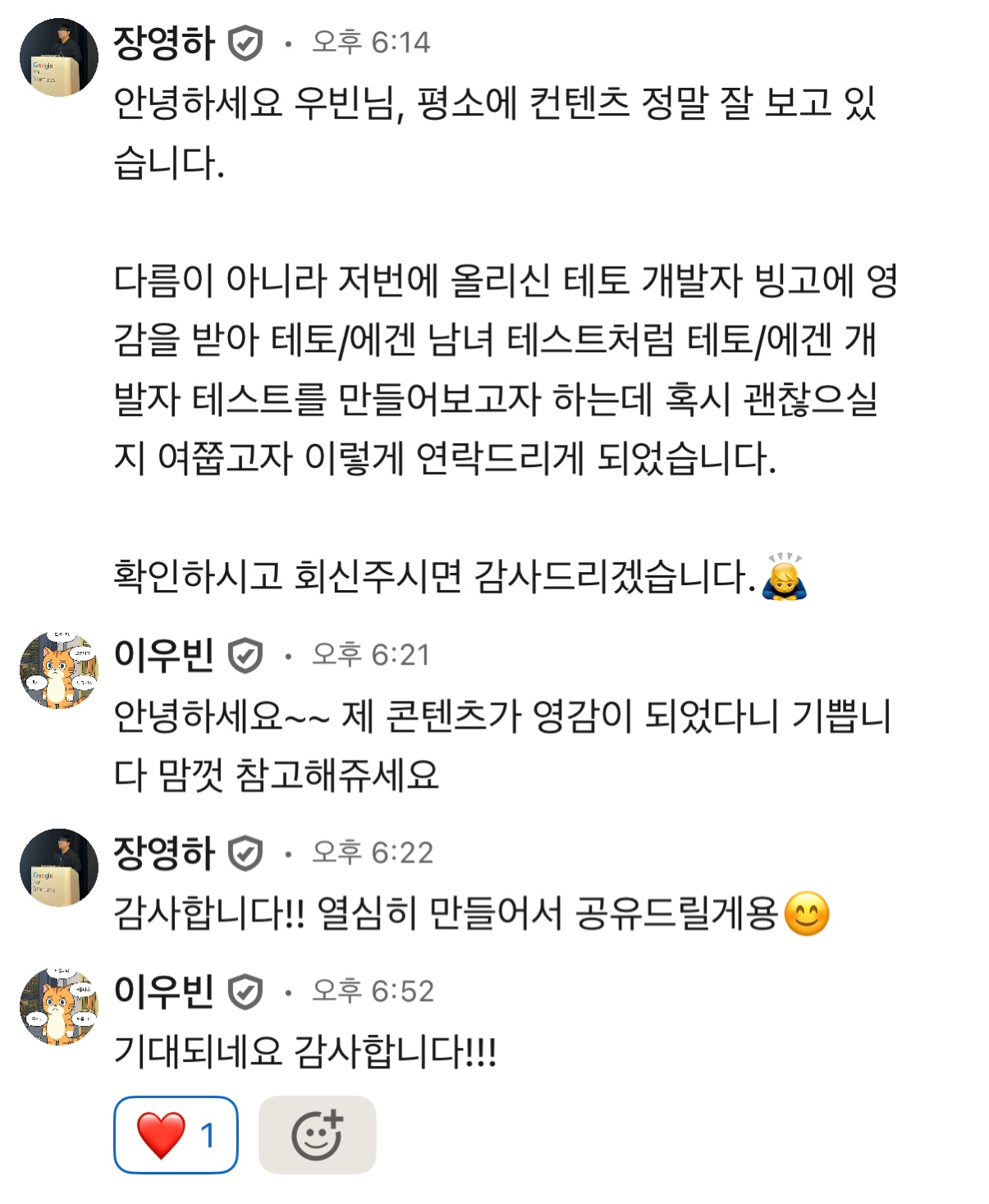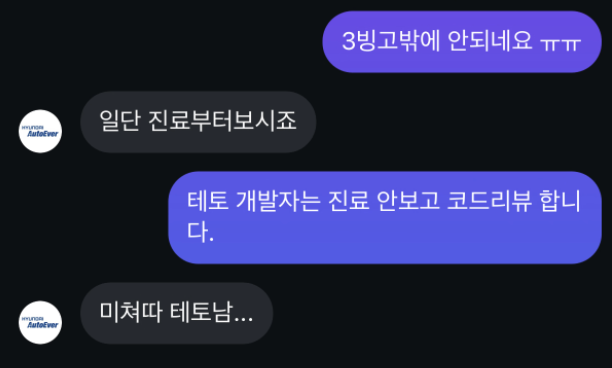 현대오토에버 공식계정과도 재밌게 얘기하고 해당 빙고를 다른 개발자 친구들과 얘기하며 웃고 떠들었었다. 그러던 중 한 친구와 단순 빙고에서 끝나는 것이 아니라 이를 유형테스트와 같은 형식으로 만들어서 사람들이 자기의 유형을 테스트하고 다른 사람에게 쉽게 공유 할 수 있도록 만들면 많은 사람들이 쓸 것 같다는 얘기가 나왔고, 추진력이 강한 나는 바로 사람을 모으기 시작했다.