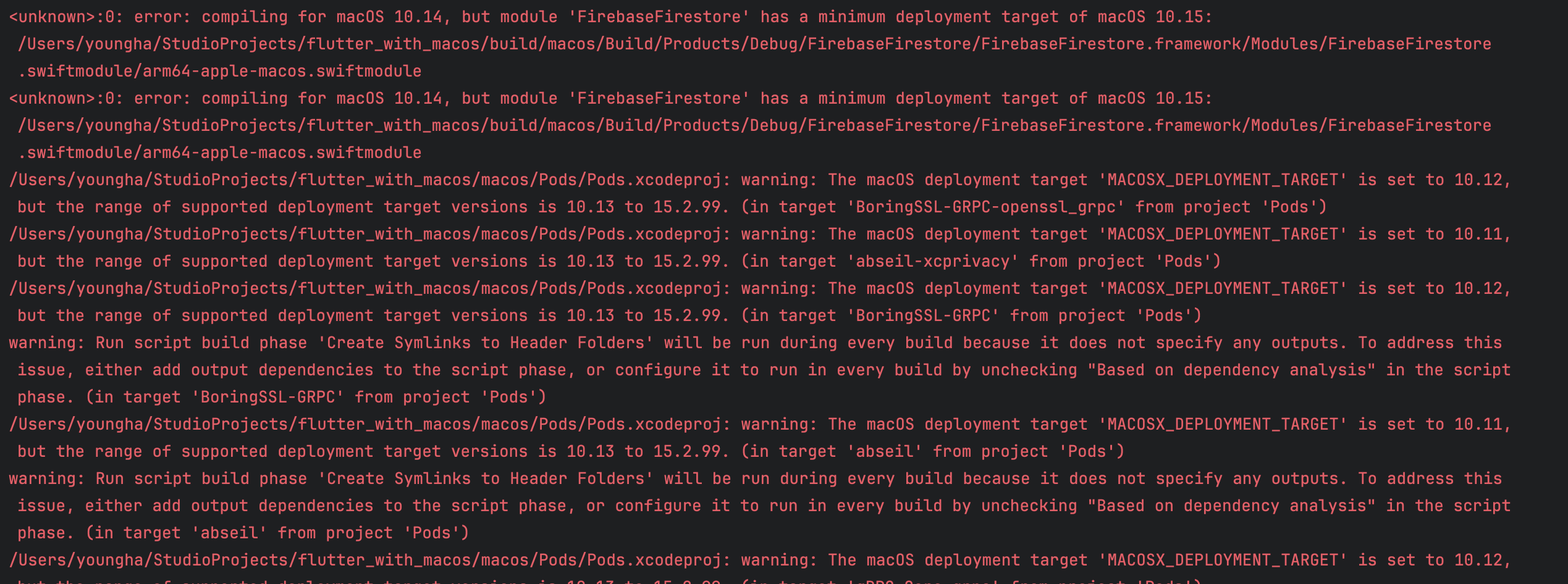 기분을 좋지 않게 해주는 친구가 마중을 나온다. 대충 해석을 해보면 cloud_firestore와 내가 설정한 MacOS 프로그램의 최소 버전이 호환되지 않는다는 내용이다.macos/Podfile에 들어가서 platform :osx, '10.14'에서 버전을 10.14에서 11.0으로 올려보자.역시나 한번에 되면 재미없죠.