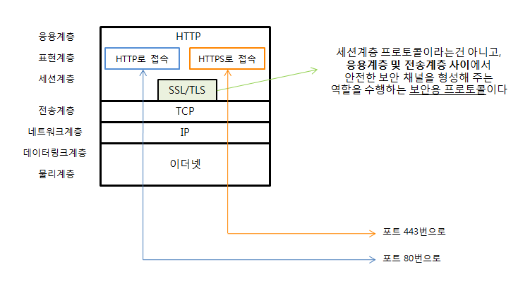 - 응용계층(HTTP)과 전송계층(TCP) 사이에 SSL/TLS이라는 보안 계층이 추가됩니다.