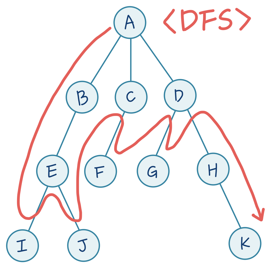 - 한 노드의 자식을 끝까지 순회한 후 다른 노드 순회