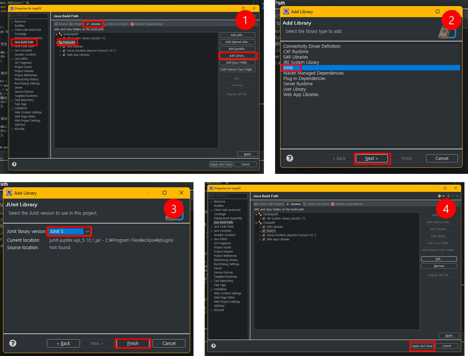 ④ JUnit 라이브러리 생성 후 프로퍼티 설정 창에 서 [Apply and Close] 클릭 하여 저장