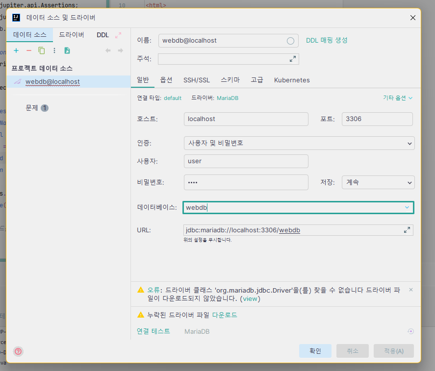String url = "jdbc:mariadb://localhost:3306/webdb";