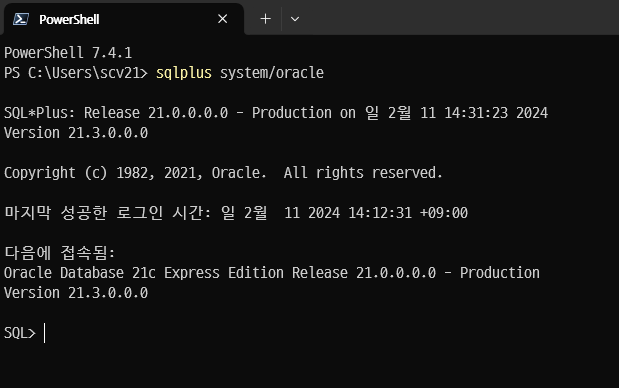 system이 계정명이고 oracle이 아까 설치 때 설정한 비밀번호이다.