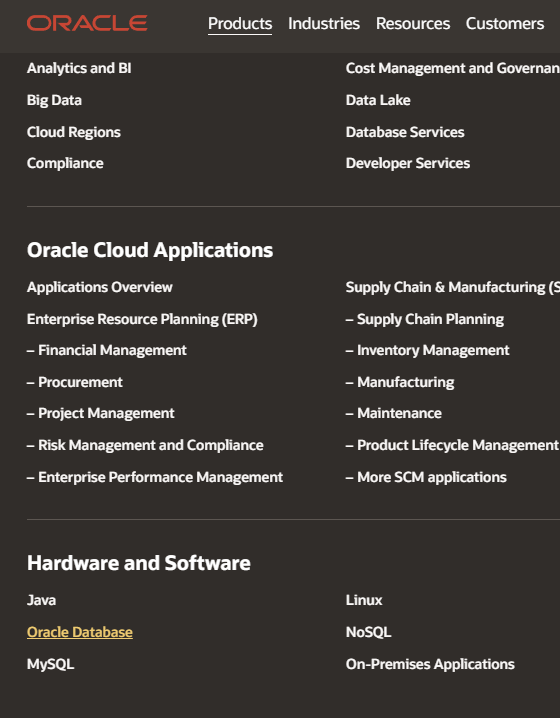 상단 메뉴바에서 Products 에서 맨 밑에 Oracle Database 클릭!