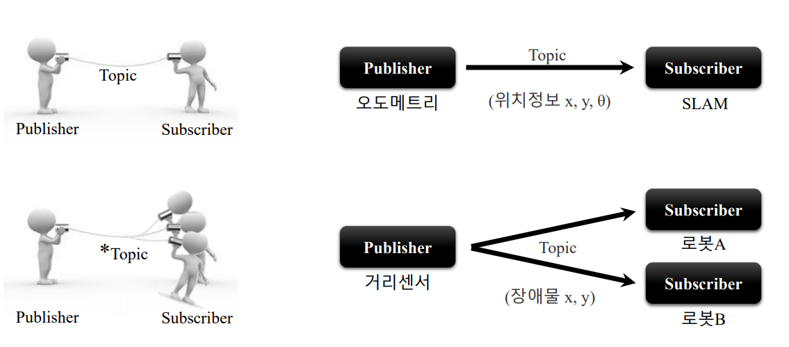 ROS는 기본적으로 Sub-Pub 모델의 메시지 큐 기반으로 데이터 통신을 제공한다.