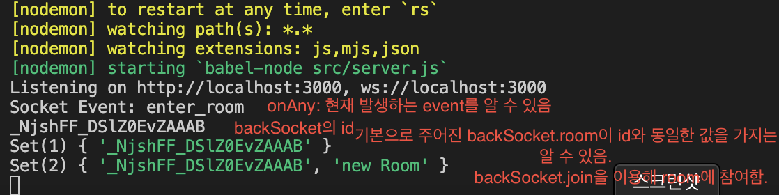 console.log(backSocket.rooms);//현재 내가 있는 room : 현재 내가 속한(기본적으로 들어가 있는) private room의 이름이 backSocket.id와 동일함을 알 수 있다.