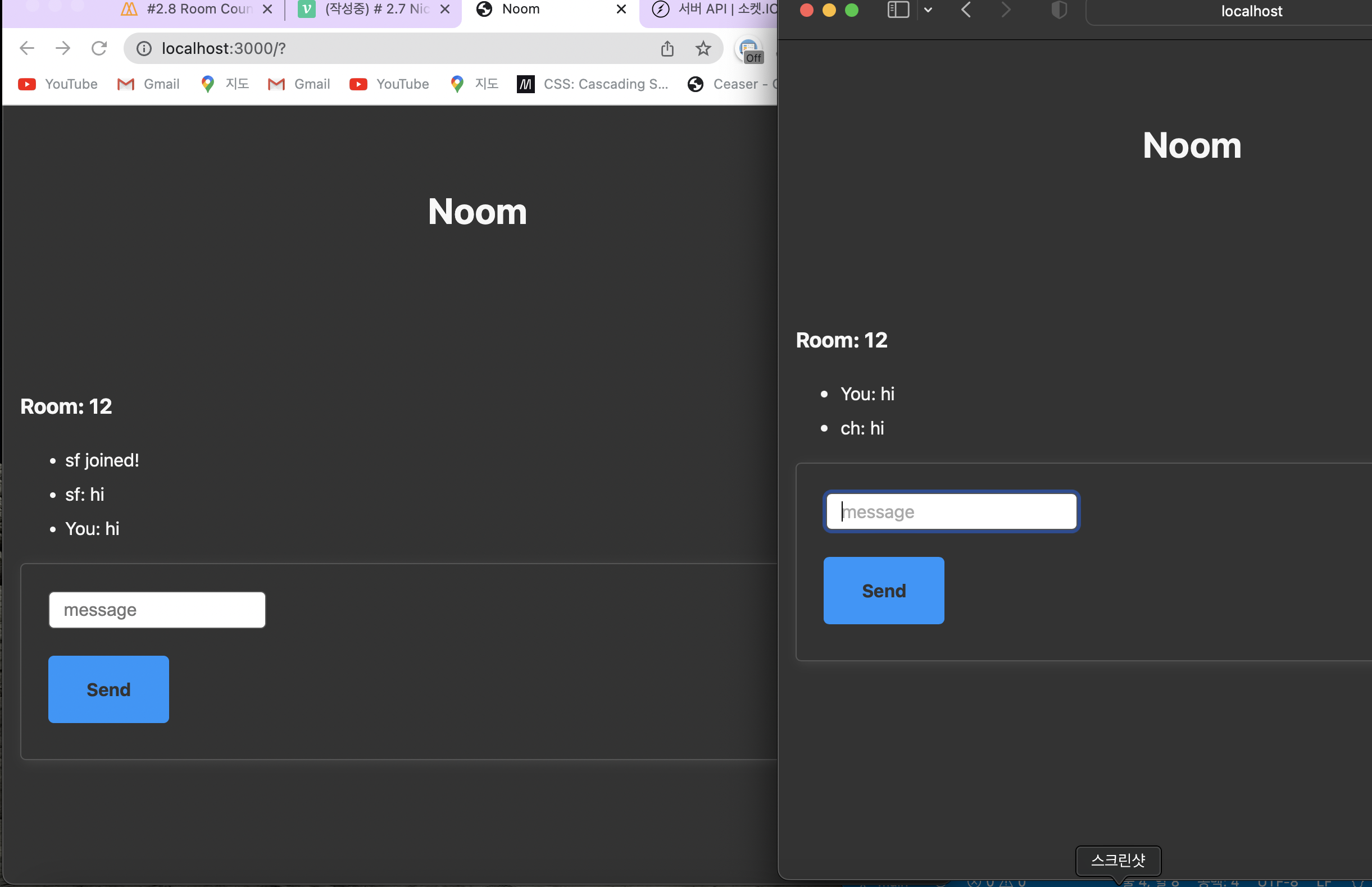 backSocket.to(room).emit("new_message", `${backSocket.nickname}: ${msg}`);//상대 메시지 창에 메시지를 보낸 출처를 나타나게 할 수 있음.