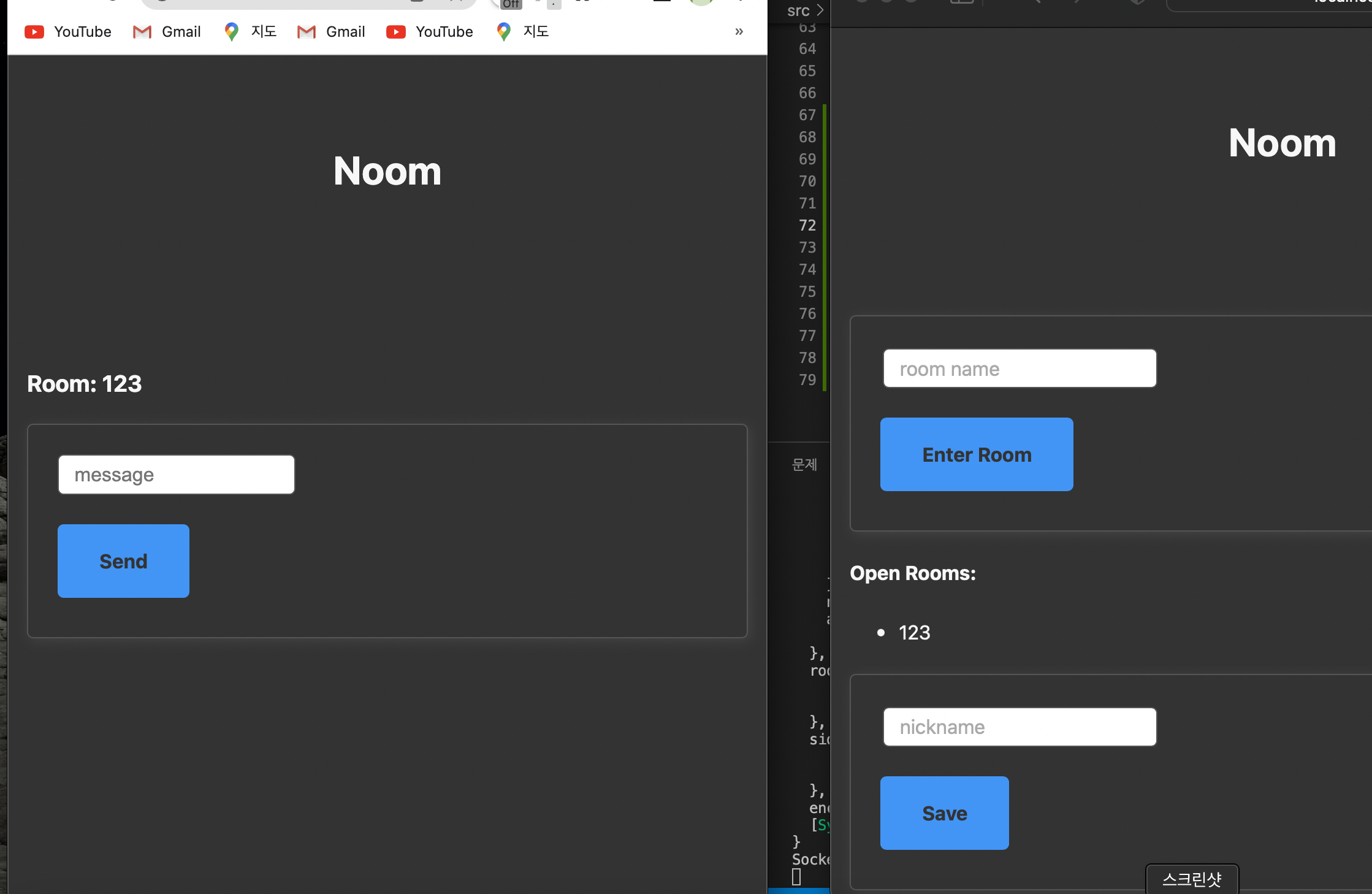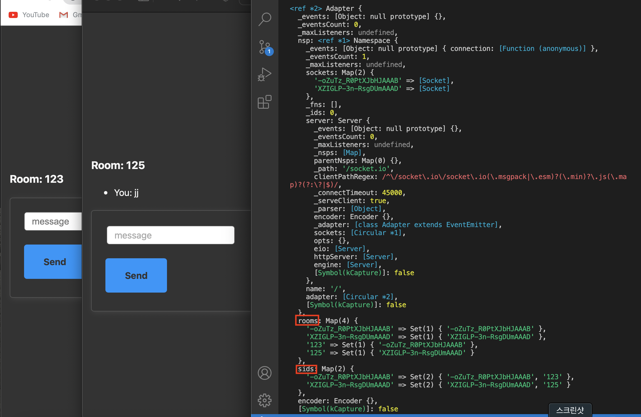 -> 어플리케이션에 있는 모든 room(모든rooms)과 socket id들(sockets), 개인방(sids- socket id로 방이 이루어짐)가 있는 것을 볼 수 있음.