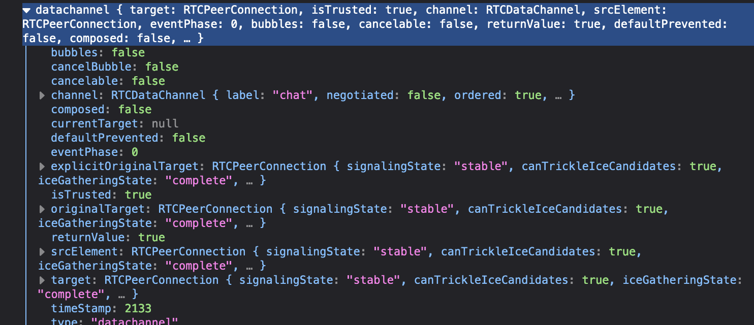 -> 이 때, 이 부분은 주인장 쪽 peer인데, 다른 쪽 peer에는 data channel을 만들 필요가 없음. 다른 peer는 data channel이 있을 때, 이벤트 리스너만 만들어주면됨.