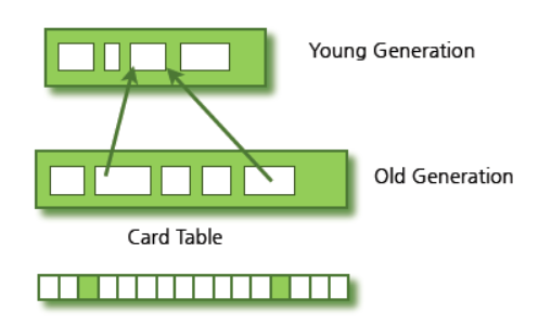 예외적인 상황으로 Old 영역에 있는 객체가 Young 영역의 객체를 참조하는 경우도 존재할 것이다. 이러한 경우를 대비하여 Old 영역에는 512 bytes의 덩어리(Chunk)로 되어 있는 카드 테이블(Card Table)이 존재한다.