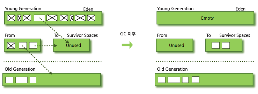 또한 Survivor영역 중 1개는 반드시 사용이 되어야한다. 만약 두 Survivor 영역에 모두 데이터가 존재하거나, 모두 사용량이 0이라면 현재 시스템이 정상적인 상황이 아님을 파악할 수 있다.