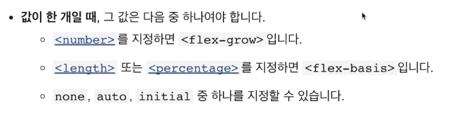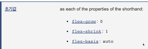 flex라는 속성은 flex-grow, flex-shrink, flex-basis를 속성값으로 가지는 단축속성(shorthand)이다.